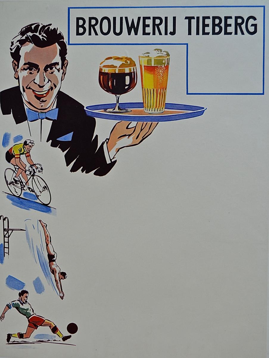 AFFICHE ENTOILÉE PASSE PARTOUT "BRASSERIE TIEBERG" VERS 1950. AVEC LE CYCLISME, LA NATATION ET LE FOOTBALL. DIMENSIONS 65 x 50 cm. Bon état.