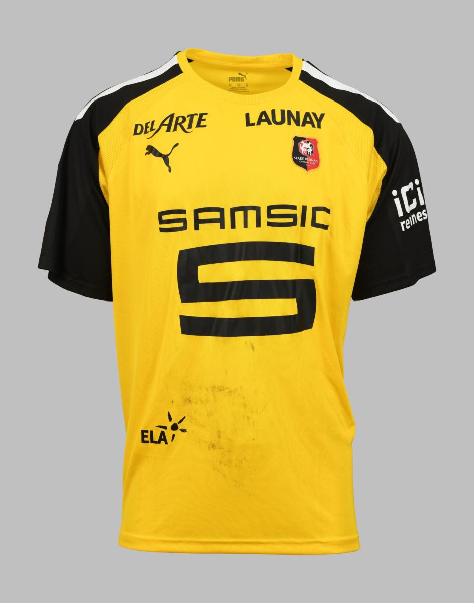 Gardien. Maillot N°16 du Stade Rennais Football Club porté lors de la saison 2020-2021 du Championnat de France de Ligue 1. Le joueur participe à 22 rencontres. Match à déterminer. Marque Puma. Modèle DRYCELL. Fabriqué en Indonésie. Taille XL. Maillot porté et non lavé avec traces de match (match worn shirt, unwashed).