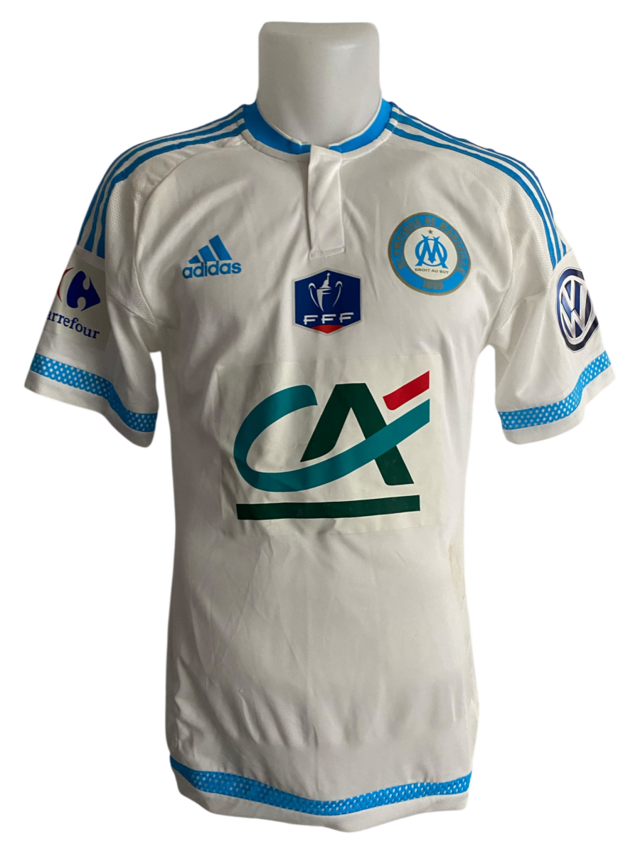 Maillot N°13 de l'Olympique de Marseille porté lors du 16ème de finale de la Coupe de France face à Montpellier le 20 janvier 2016. Le joueur joue 4 minutes. Marque Adidas. Taille 4.