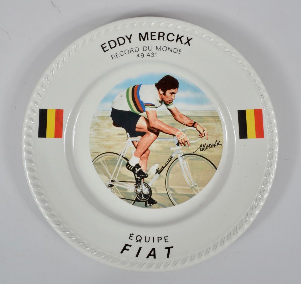 ASSIETTE COMMÉMORATIVE D'EDDY MERCKX ÉQUIPE FIAT DU RECORD DU MONDE DE L'HEURE EN 49.431 km. Diamètre 24 cm.