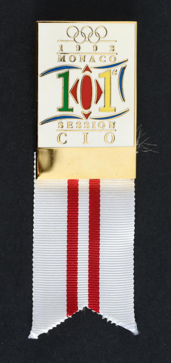 BADGE DE LA 101ÈME SESSION DU CIO AVEC SON RUBAN EN BRONZE DORÉ ET ÉMAIL DU CONGRÈS DE MONACO 1993 POUR LES JO DE 2000. DIMENSIONS 35 x 54 mm. État d'usage.