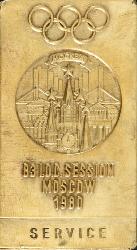 BADGE OFFICIEL DE "SERVICE" POUR LA 83ÈME SESSION DU CIO (RUBAN MANQUANT) EN BRONZE DORÉ DES JO DE MOSCOU 1980. DIMENSIONS 33 x 61 mm. État d'usage. |