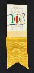 BADGE DE LA 100ÈME SESSION DU CIO AVEC SON RUBAN JAUNE EN BRONZE DORÉ DU CONGRÈS DE LAUSANNE 1993. DIMENSIONS 32 x 67 mm. État d'usage. |