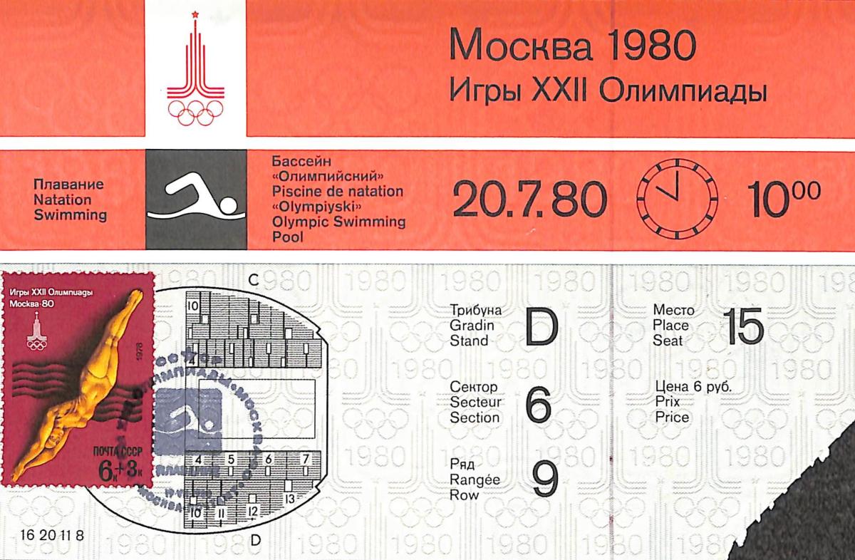 Billet des Jeux Olympiques de Moscou. Epreuves de natation du 20/7/80. Avec timbre et cachet.