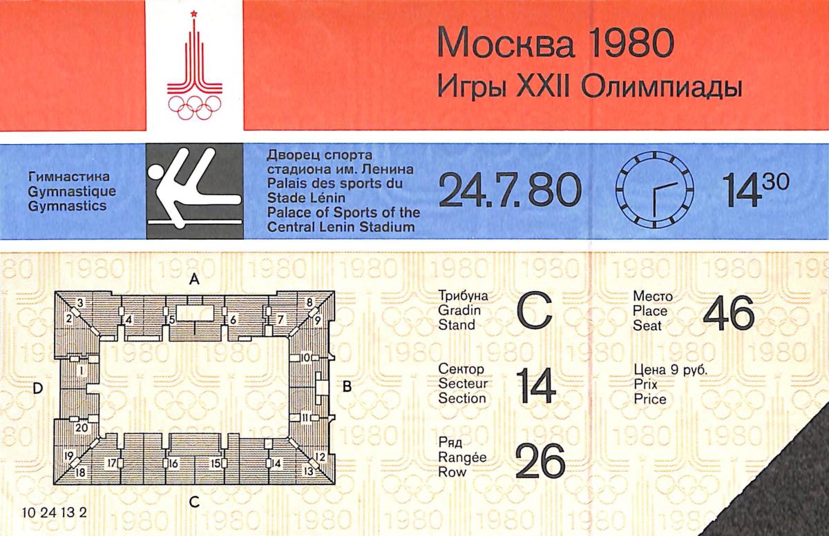 Billet des Jeux Olympiques de Moscou. Epreuves de gymnastique du 24/7/80.