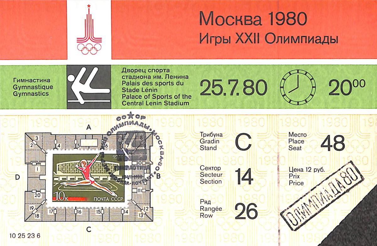 Billet des Jeux Olympiques de Moscou. Epreuves de gymnastique du 25/7/80. Avec timbre et cachet.