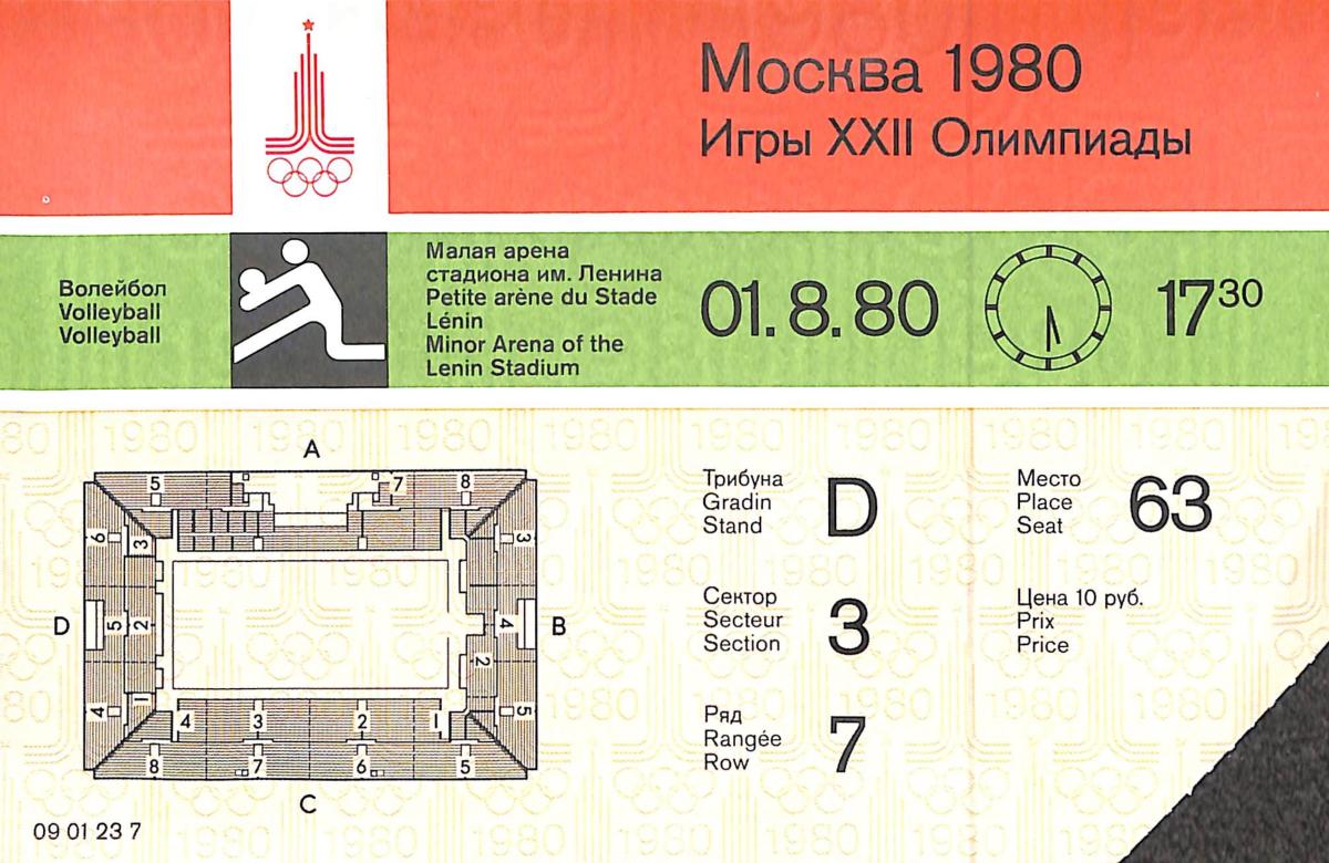 Billet des Jeux Olympiques de Moscou. Epreuves de volley-ball du 01/8/80.