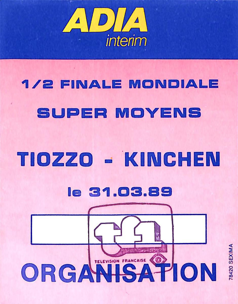 BILLET DU COMBAT ENTRE CHRISTOPHE TIOZZO ET JAMES KINCHEN DU 31 MARS 1989. État d'usage.