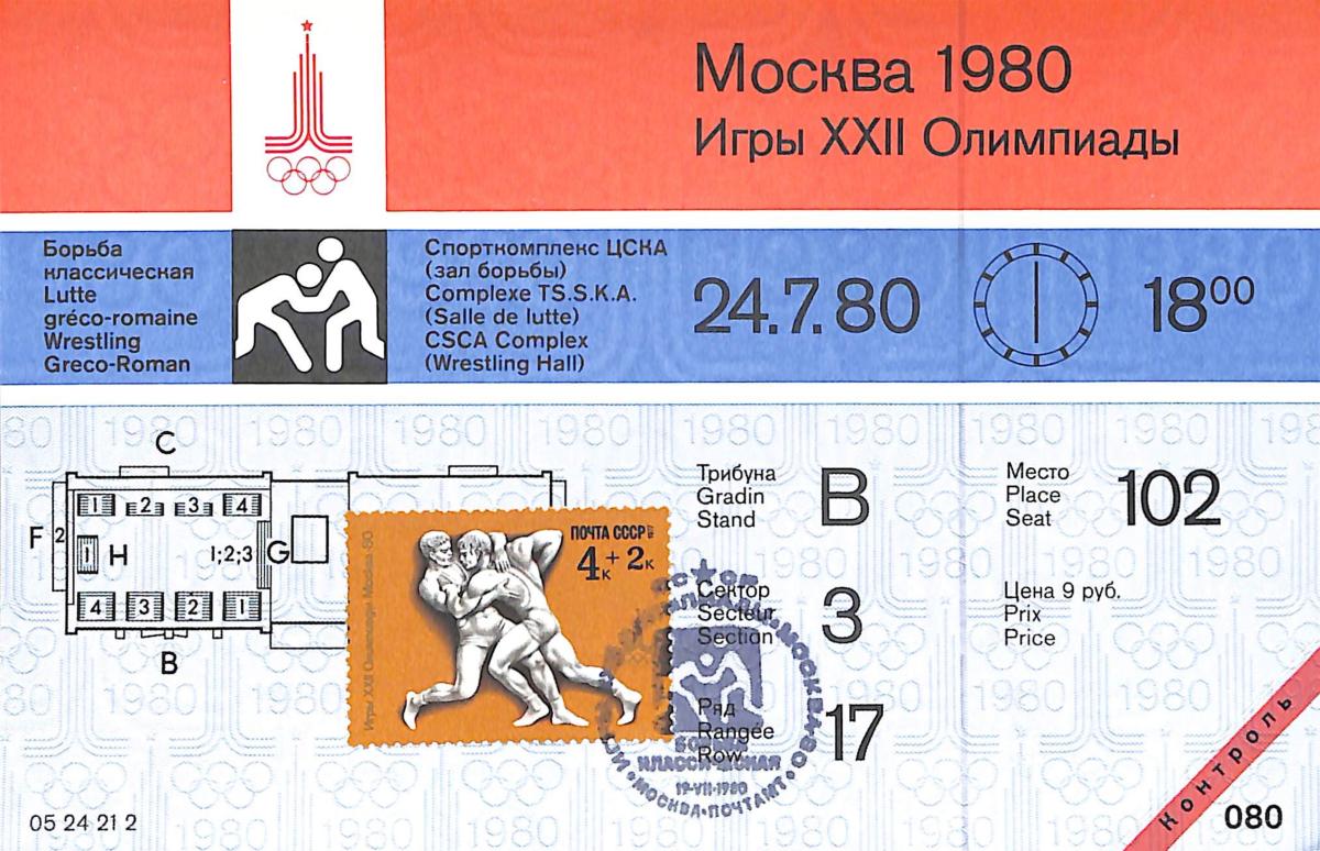 Billet entier des Jeux Olympiques de Moscou. Epreuves de lutte gréco-romaine du 24/7/80. Avec timbre et cachet.
