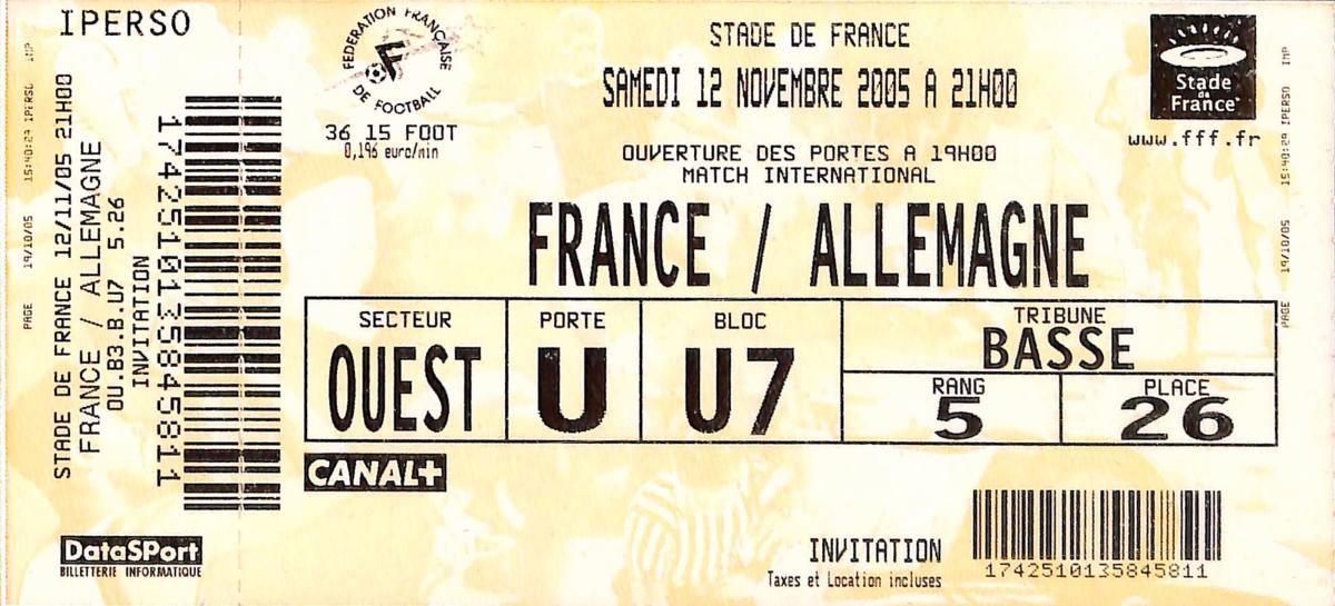 Billet entier du match entre la France et l'Allemagne le 12 novembre 2005. Match de qualification pour la Coupe de Monde 2006. Bon état (photo non contractuelle).