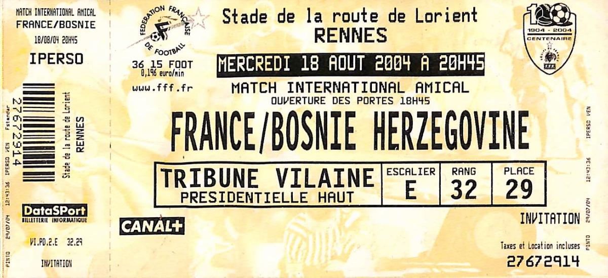 Billet entier du match entre la France et la Bosnie Herzégovine le 18 août 2004. Match amical. Bon état (photo non contractuelle).