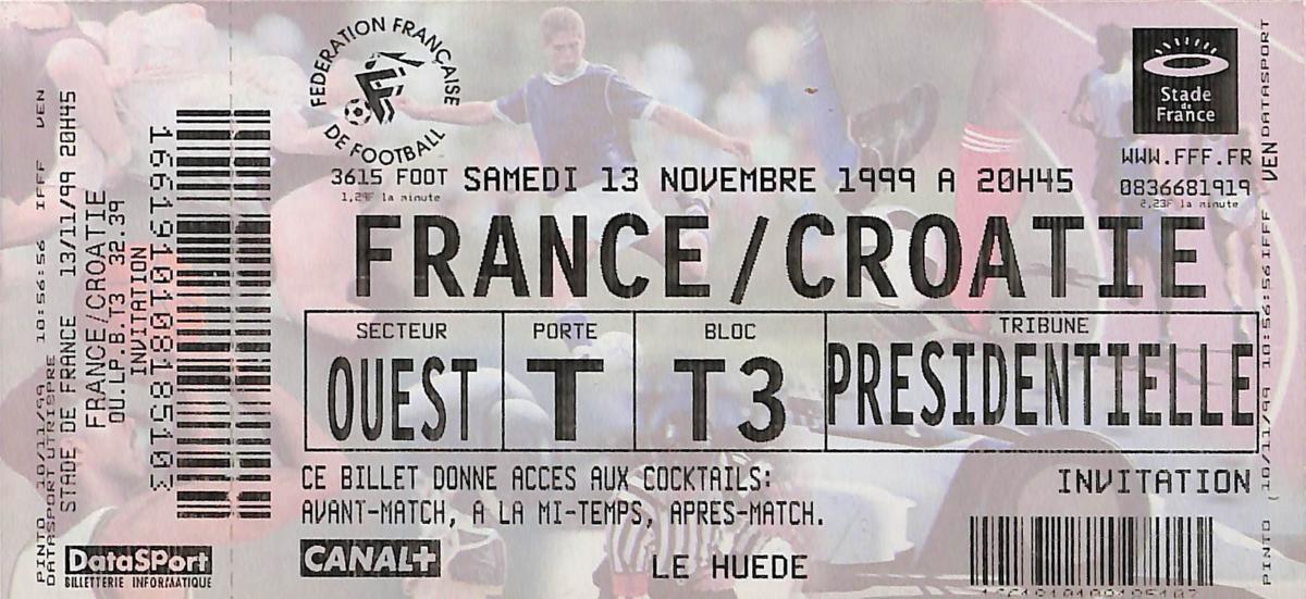 Billet entier du match entre la France et la Croatie le 13 novembre 1999. Match de préparation pour l'Euro 2000. Bon état (photo non contractuelle).