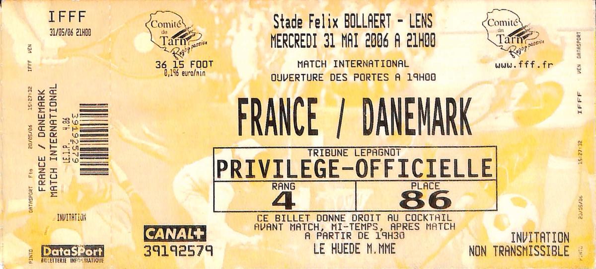 Billet entier du match entre la France et le Danemark le 31 mai 2006. Match de qualification pour l'Euro 2008. Bon état.