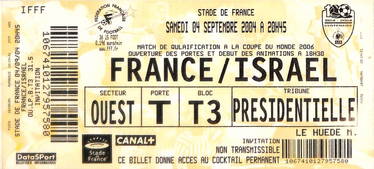 Billet entier du match entre la France et l'Israël le 4 septembre 2004. Match de qualification pour la Coupe du Monde 2006. Bon état.