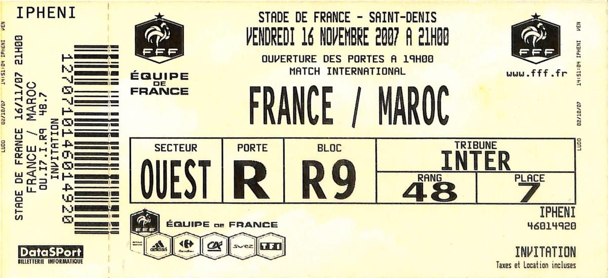 Billet entier du match entre la France et le Maroc le 16 novembre 2007. Match amical. Bon état (photo non contractuelle).