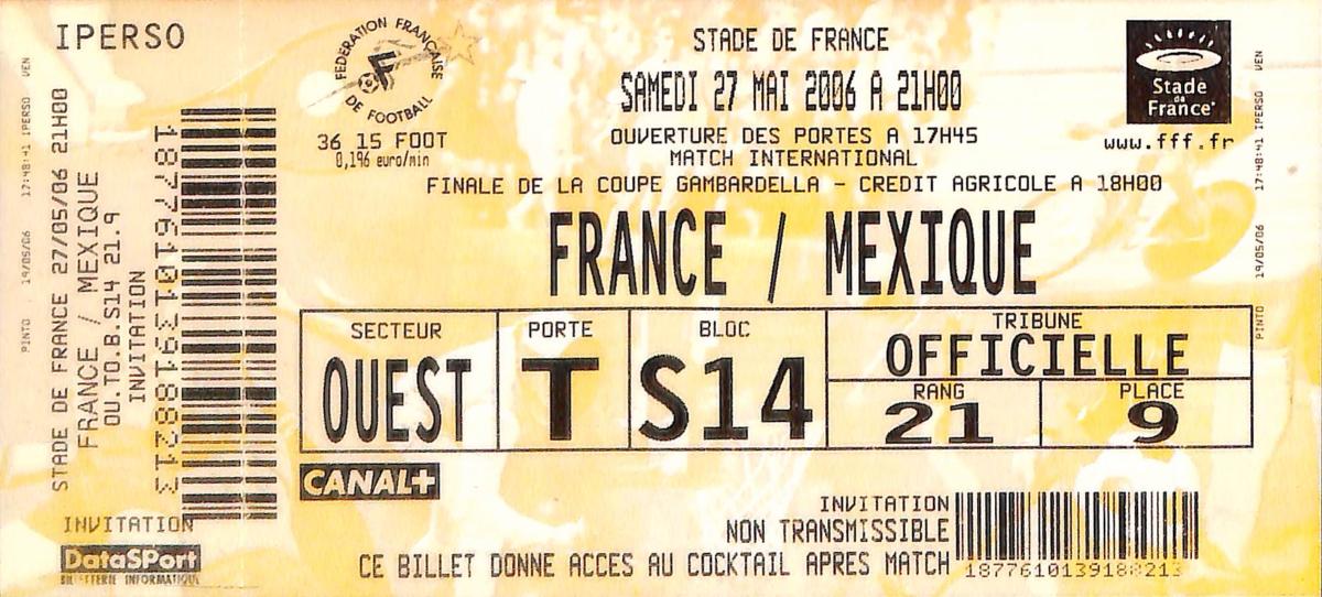 Billet entier du match entre la France et le Mexique le 27 mai 2006. Match amical. Bon état (photo non contractuelle).