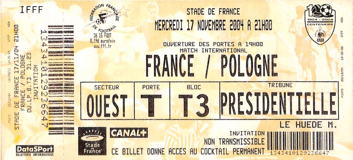 Billet entier du match entre la France et la Pologne le 17 novembre 2004. Match amical. Bon état.
