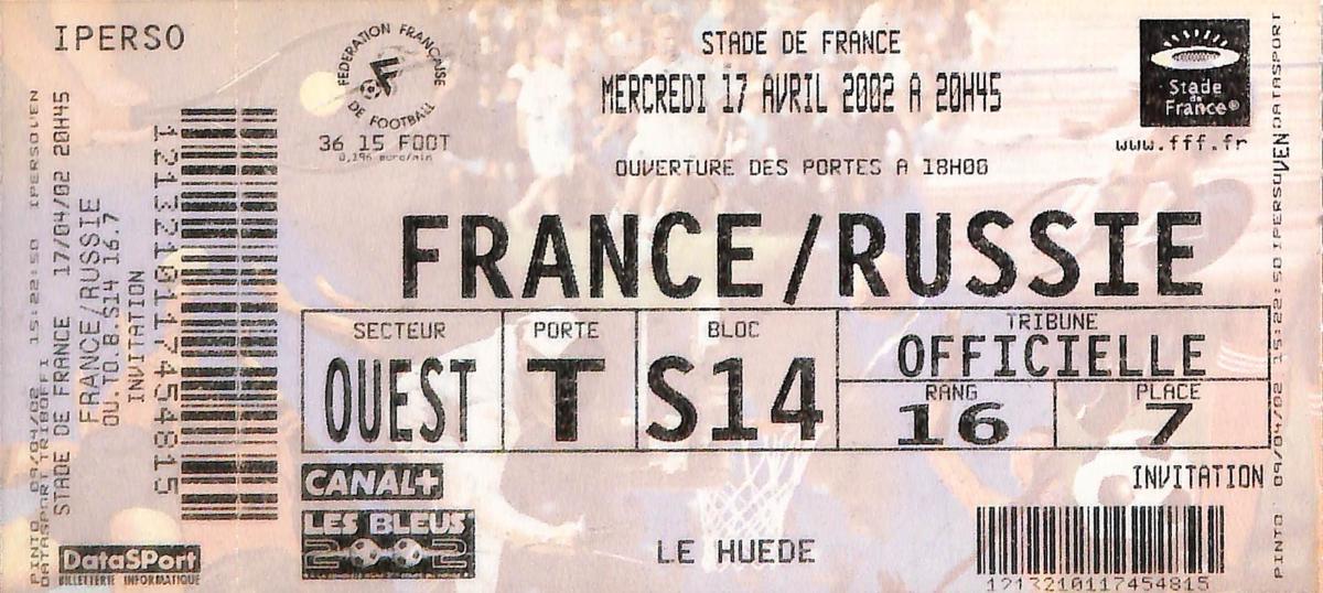 Billet entier du match entre la France et la Russie le 17 avril 2002. Match amical. Bon état (photo non contractuelle).