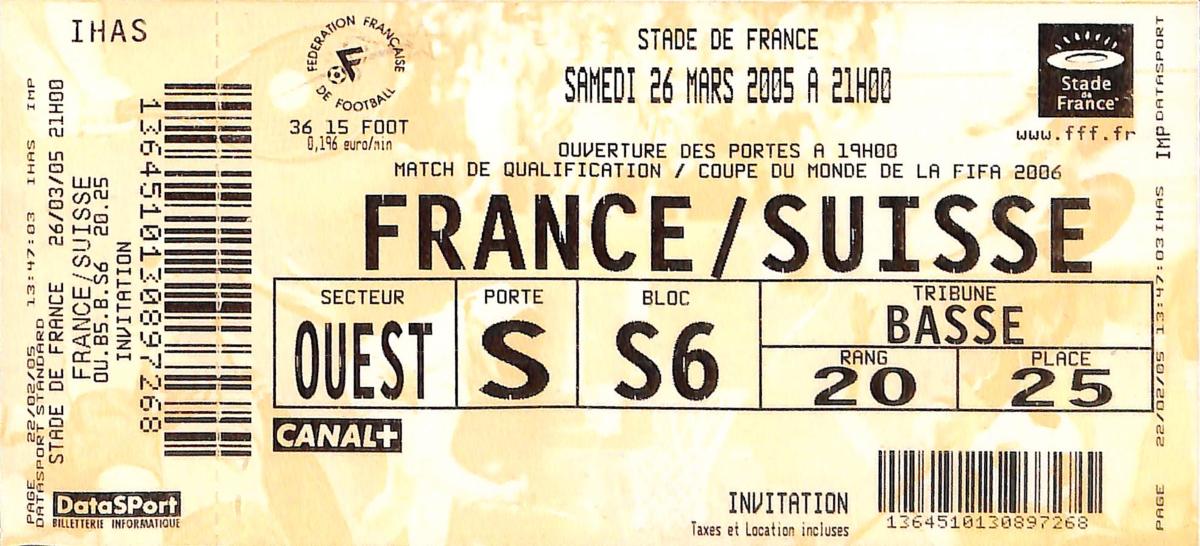 Billet entier du match entre la France et la Suisse le 26 mars 2005. Match de qualification pour la Coupe de Monde 2006. Bon état (photo non contractuelle).