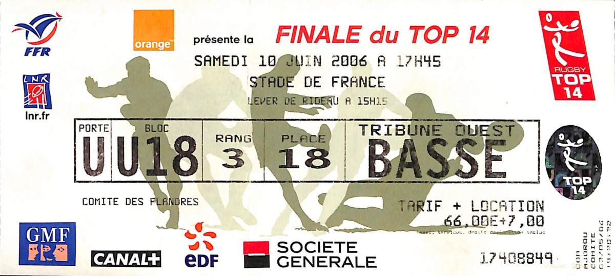 BILLET FINALE CHAMPIONNAT DE FRANCE 2006 DE RUGBY. BIARRITZ OLYMPIQUE VS STADE TOULOUSAIN. BON ÉTAT (AVEC PLIURE).