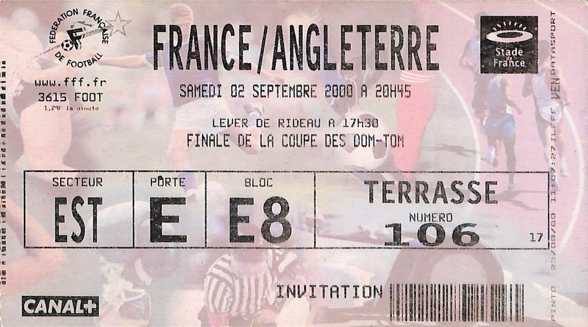Billet du match entre la France et l'Angleterre le 2 septembre 2000. Match amical. Bon état.