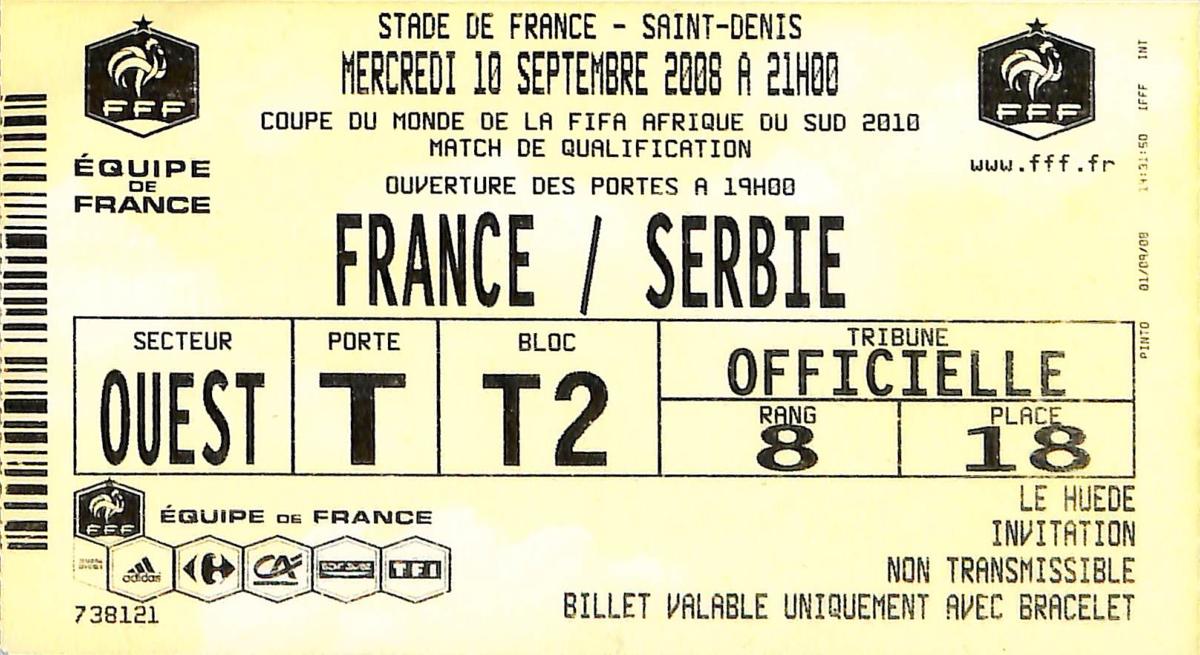 Billet du match entre la France et la Serbie le 10 septembre 2008. Match de qualification pour la Coupe du Monde 2010. Bon état.