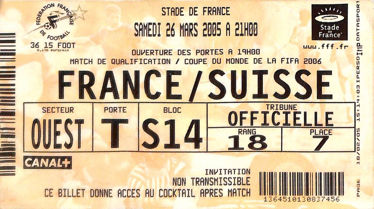 Billet du match entre la France et la Suisse le 26 mars 2005. Match de qualification pour la Coupe du Monde 2006. Bon état.