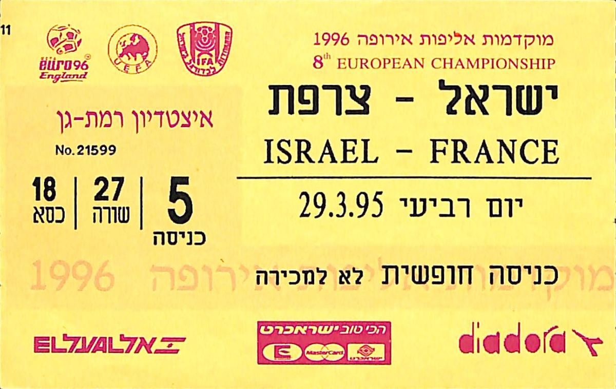 Billet du match entre l'Israël et la France le 29 mars 1995. Match de qualification pour l'Euro 96. Bon état.