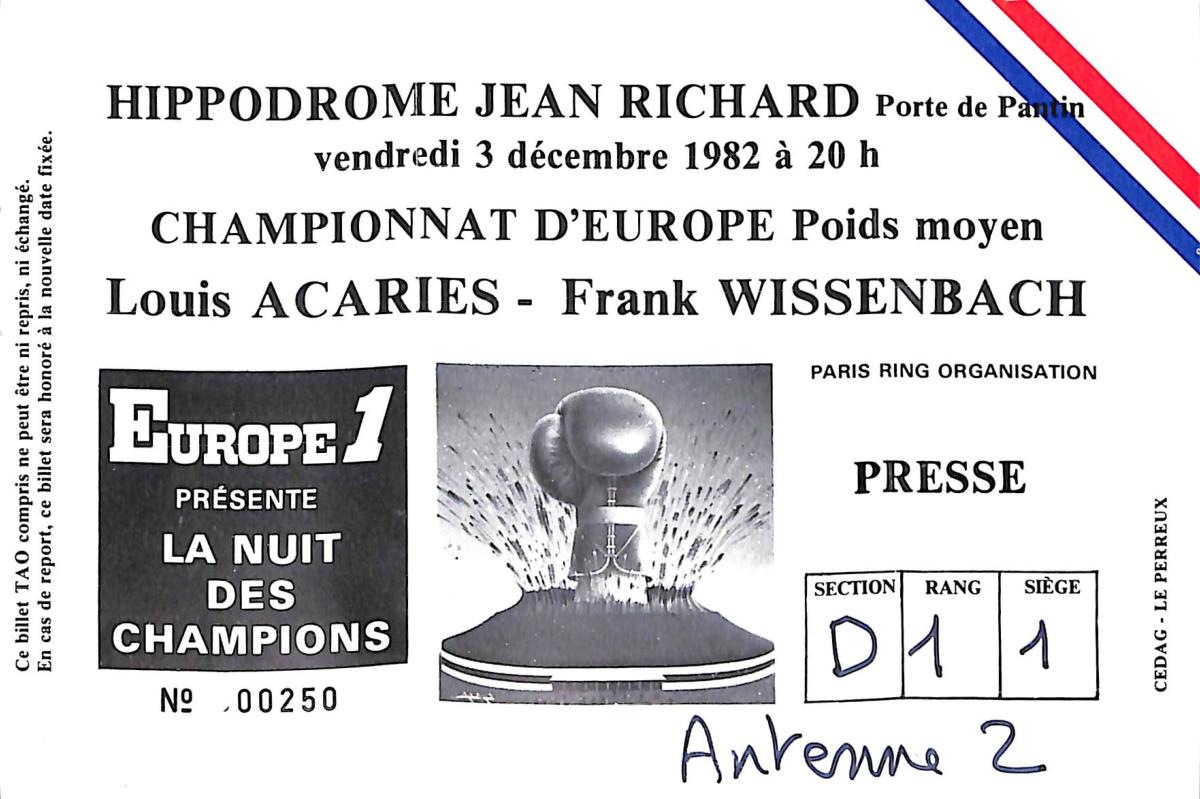 BILLET PRESSE DU CHAMPIONNAT ENTRE LOUIS ACARIES ET FRANK WISSENBACH DU 3 DÉCEMBRE 1982. État d'usage.