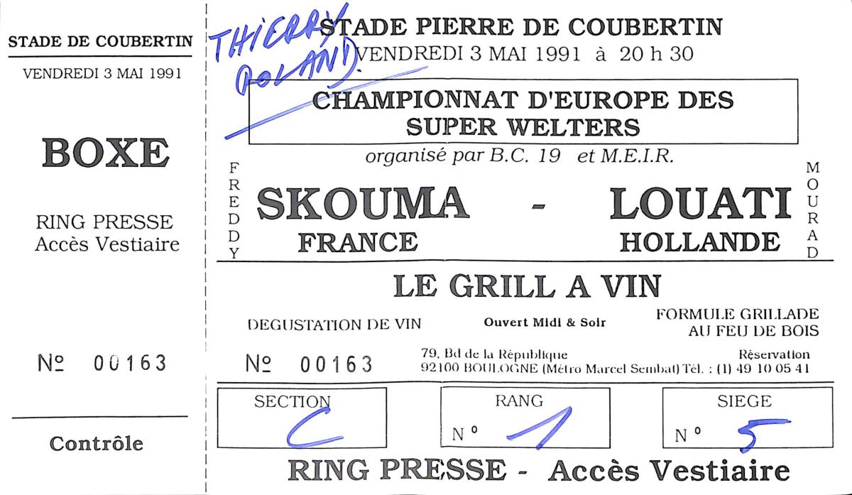 BILLET PRESSE DU CHAMPIONNAT D'EUROPE ENTRE SAID SKOUMA ET MOURAD LOUATI DU 3 MAI 1991. État d'usage.