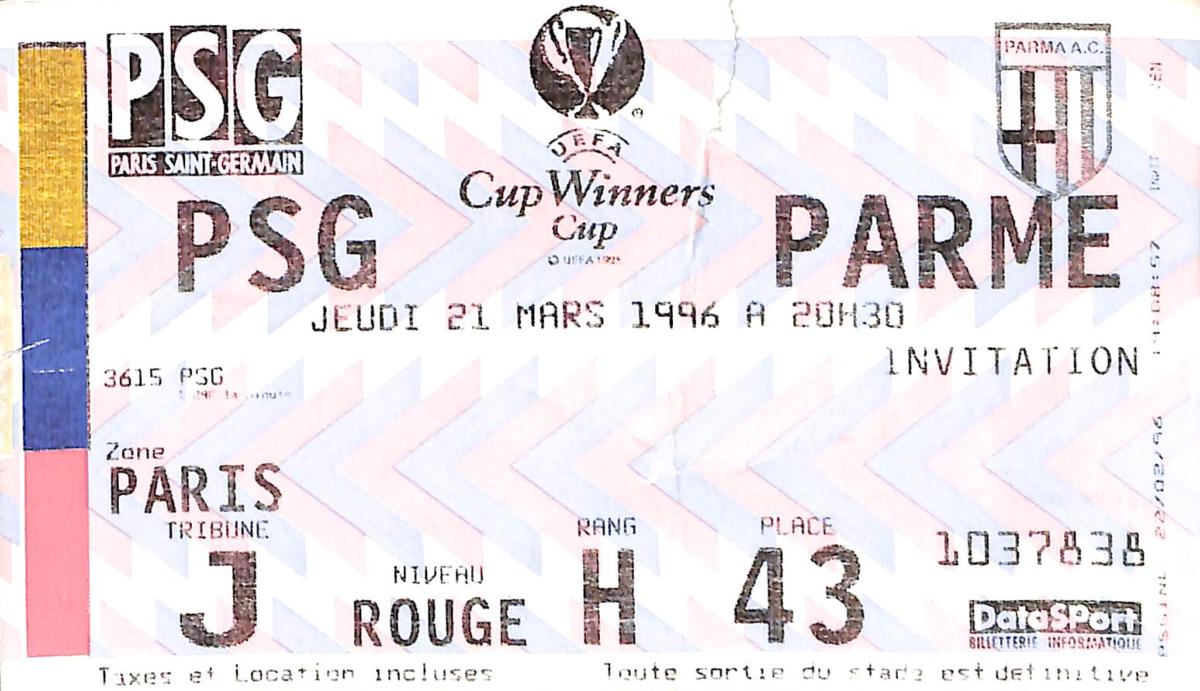 BILLET DU MATCH ENTRE LE PSG ET PARME LE 21 MARS 1996. MATCH DU 1/4 DE FINALE DE LA COUPE DES VAINQUEURS DE COUPES. ÉTAT D'USAGE (LÉGÈRE DÉCHIRURE AVEC PLIURE).