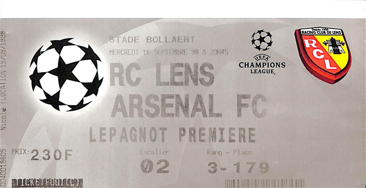BILLET DU MATCH ENTRE LE RC LENS ET ARSENAL FC LE 16 SEPTEMBRE 1998. MATCH DE LIGUE DES CHAMPIONS. BON ÉTAT (AVEC PLIURE).