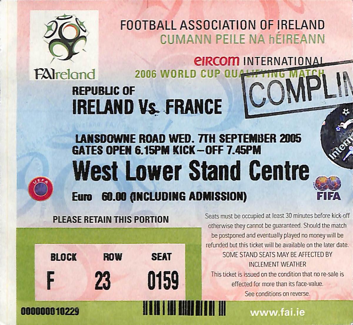 Billet du match entre la République d'Irlande le 7 septembre 2005. Match de qualification pour la Coupe du Monde 2006. Bon état.
