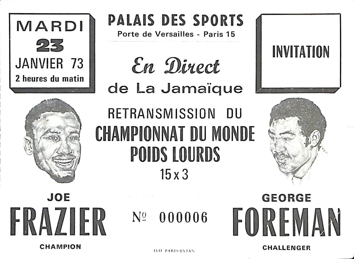 BILLET DE LA RETRANSMISSION DU CHAMPIONNAT DU MONDE ENTRE JOE FRAZIER ET GEORGE FOREMAN DU 23 JANVIER 1973. État d'usage.