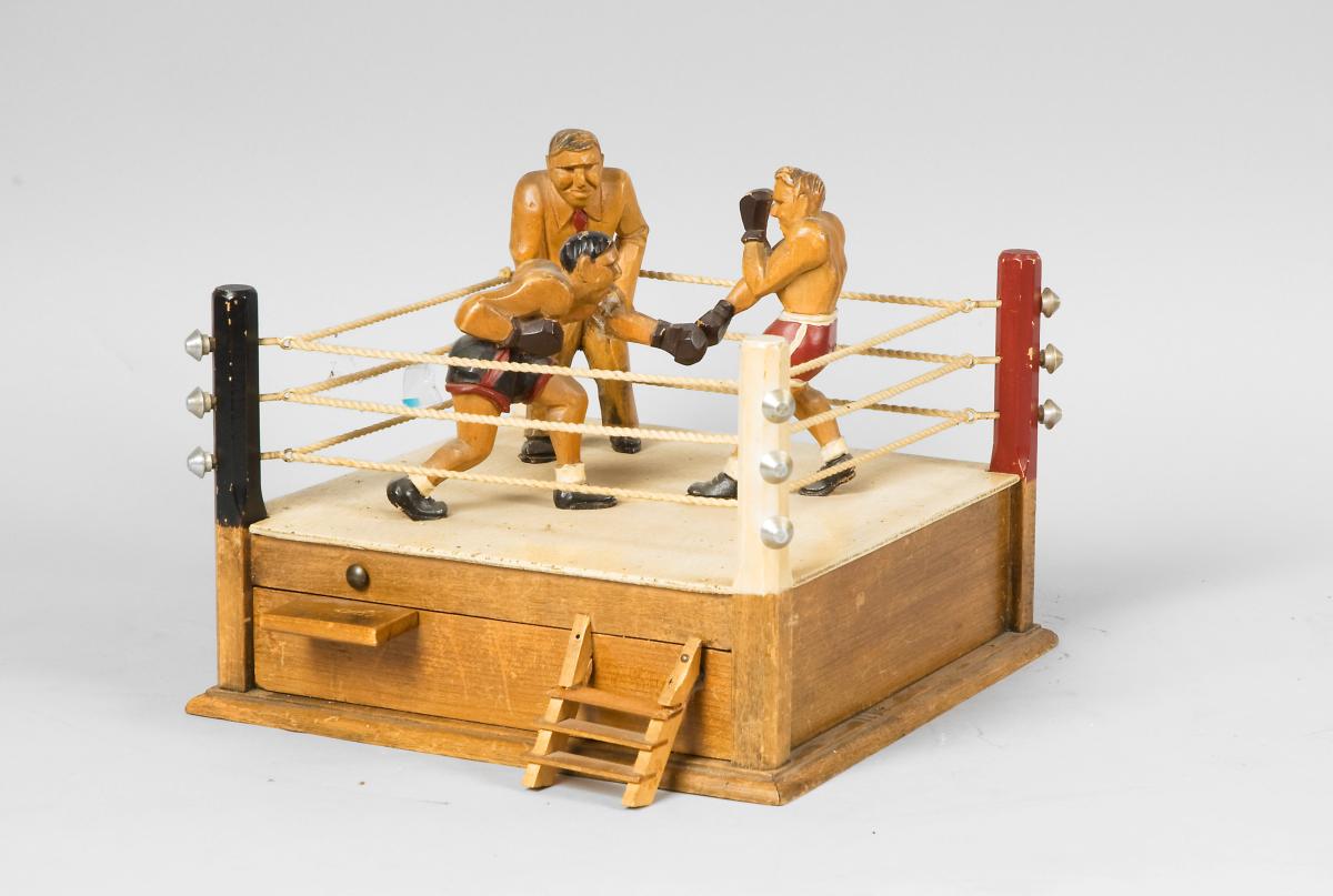 BOÎTE À TIROIR REPRÉSENTANT UN COMBAT DE BOXE SUR LE RING. PERSONNAGES EN BOIS EN ACTION SOUS L'ŒIL DE L’ARBITRE. SUPERBE RÉALISATION. Dimensions 24 x 24 x 20 cm. État d'usage (accident sur un bras et petit manque sur l'escalier).
