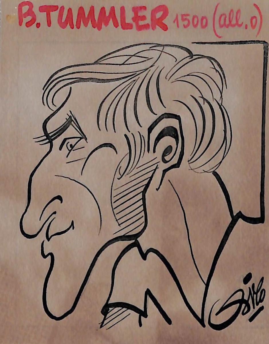Dessin original de Bodo TUMMLER (1500 mètres) signé Pierre Rollot dit SIRO (1914-2005) à l'encre sur papier calque. Format 8x10,5 cm. Bon état.