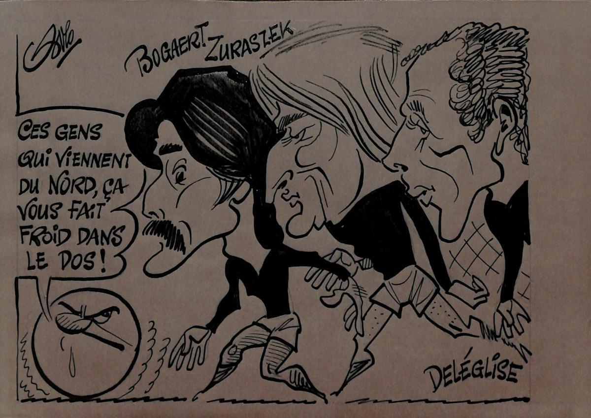 DESSIN ORIGINAL DE BOGAERT, JURASZEK ET DELÉGLISE (HAZEBROUCK) (ERREUR DANS L'ORTHOGRAPHE SUR LE DESSIN) SIGNÉ PIERRE ROLOT DIT SIRO (1914-2005) À L'ENCRE SUR PAPIER CALQUE. Format 16x21 cm. Bon état.