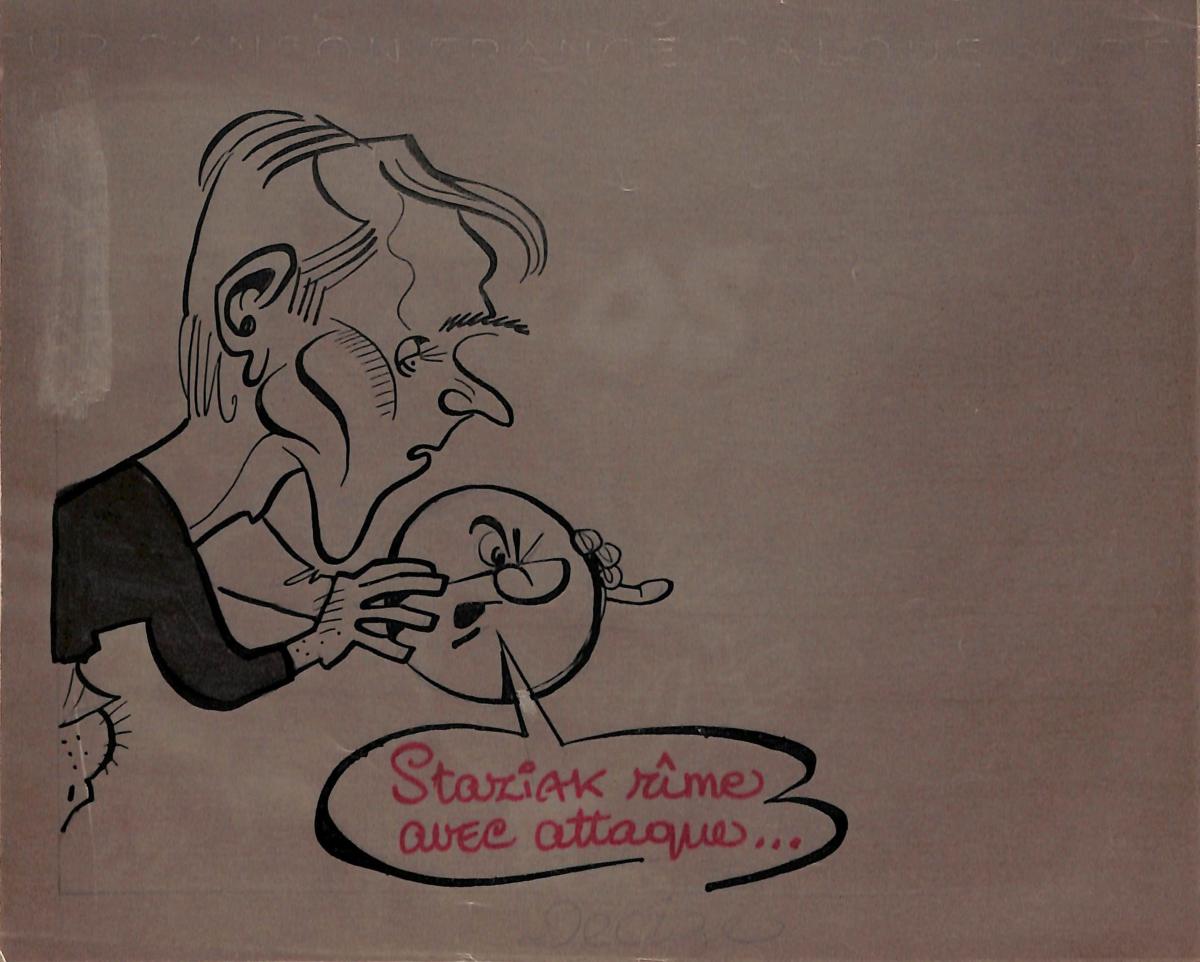 DESSIN ORIGINAL DE FRANÇOIS STASIAK PAR PIERRE ROLOT DIT SIRO (1914-2005) À L'ENCRE SUR PAPIER CALQUE. Format 16x21 cm. Bon état.