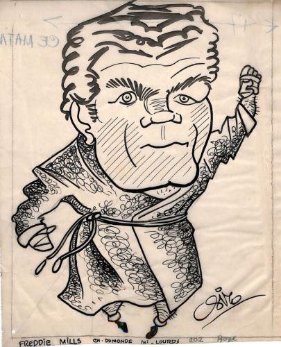 Dessin original de Freddie MILLS (Poids mi-lourds) signé Pierre Rollot dit SIRO (1914-2005) à l'encre sur papier calque. Format 17x20 cm. Bon état.
