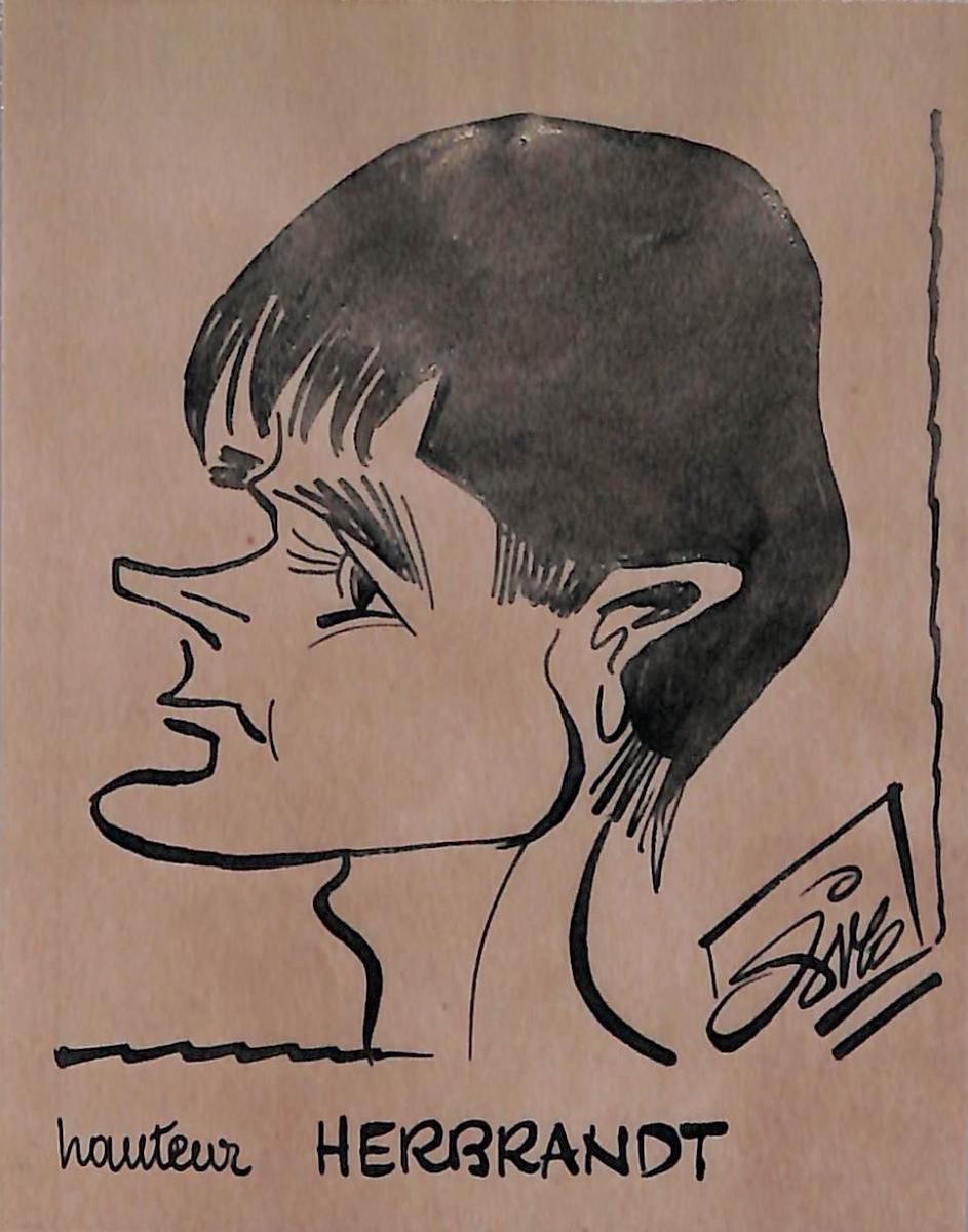 Dessin original de Freddy HERBRAND (Erreur dans l'orthographe sur le dessin) (Décathlon) signé Pierre Rollot dit SIRO (1914-2005) à l'encre sur papier calque. Format 8x10,5 cm. Bon état.