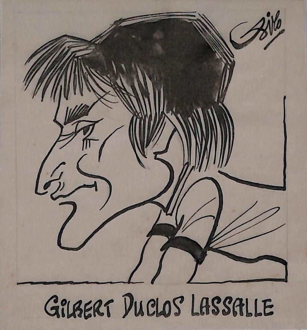 Dessin original de Gilbert DUCLOS LASSALLE signé Pierre Rollot dit SIRO (1914-2005) à l'encre sur papier calque. Format 9x10 cm. Bon état.