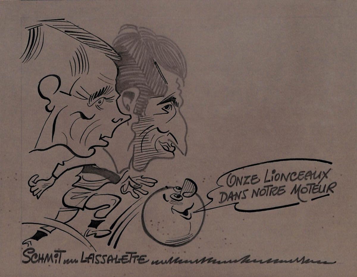 DESSIN ORIGINAL DE SCHMIT ET LASSALETTE (SOCHAUX) PAR PIERRE ROLOT DIT SIRO (1914-2005) À L'ENCRE SUR PAPIER CALQUE. Format 16x21 cm. Bon état.