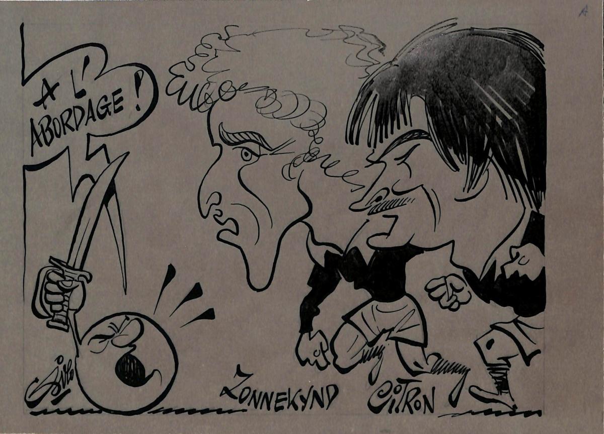 DESSIN ORIGINAL DE ZOONEKYND ET CITRON (DUNKERQUE) (ERREUR DANS L'ORTHOGRAPHE SUR LE DESSIN) SIGNÉ PIERRE ROLOT DIT SIRO (1914-2005) À L'ENCRE SUR PAPIER CALQUE. Format 16x21 cm. Bon état.