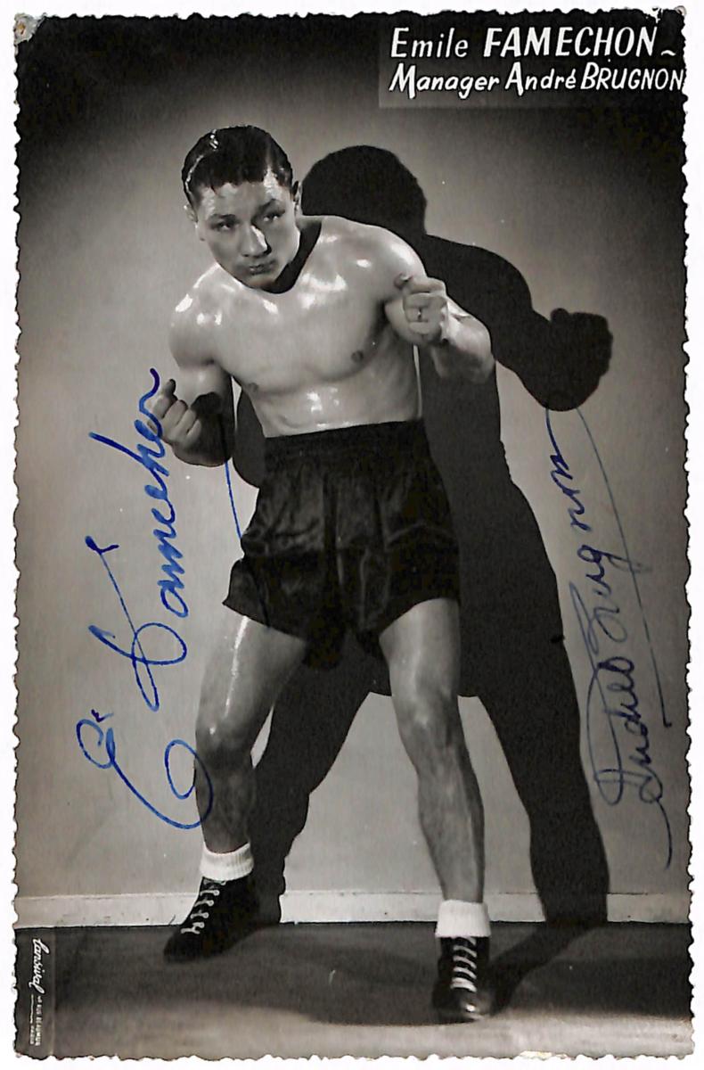 CARTE PHOTO D'ÉMILE FAMECHON AVEC AUTOGRAPHE DU BOXEUR. Format 9x13,5 cm. Bon état d'usage.