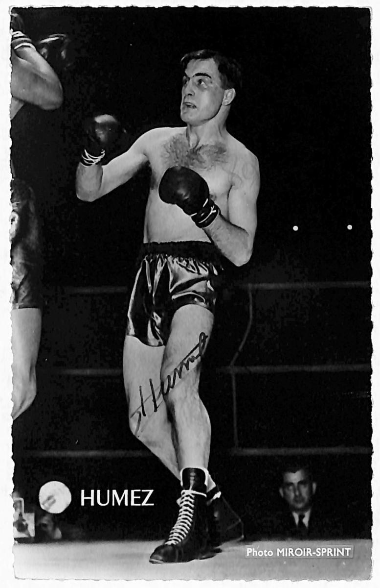 CARTE PHOTO DE CHARLES HUMEZ AVEC AUTOGRAPHE DU BOXEUR (PHOTO MIROIR-SPRINT). Format 9x14 cm. Bon état d'usage.
