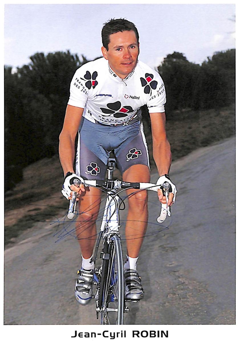 Carte photo de Jean-Cyril ROBIN autographiée. Équipe la Française des Jeux 2002. Format 10,5x15 cm. Bon état.