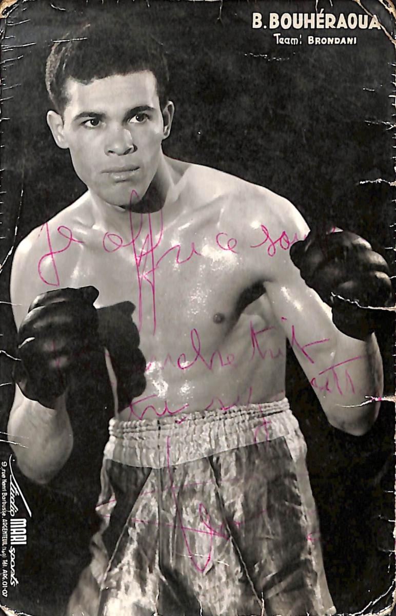 Carte photo dédicacée à Jean Jacques Benchetrit par B.Bouhéraoua. Etat moyen avec coins arrondis et pliures.
