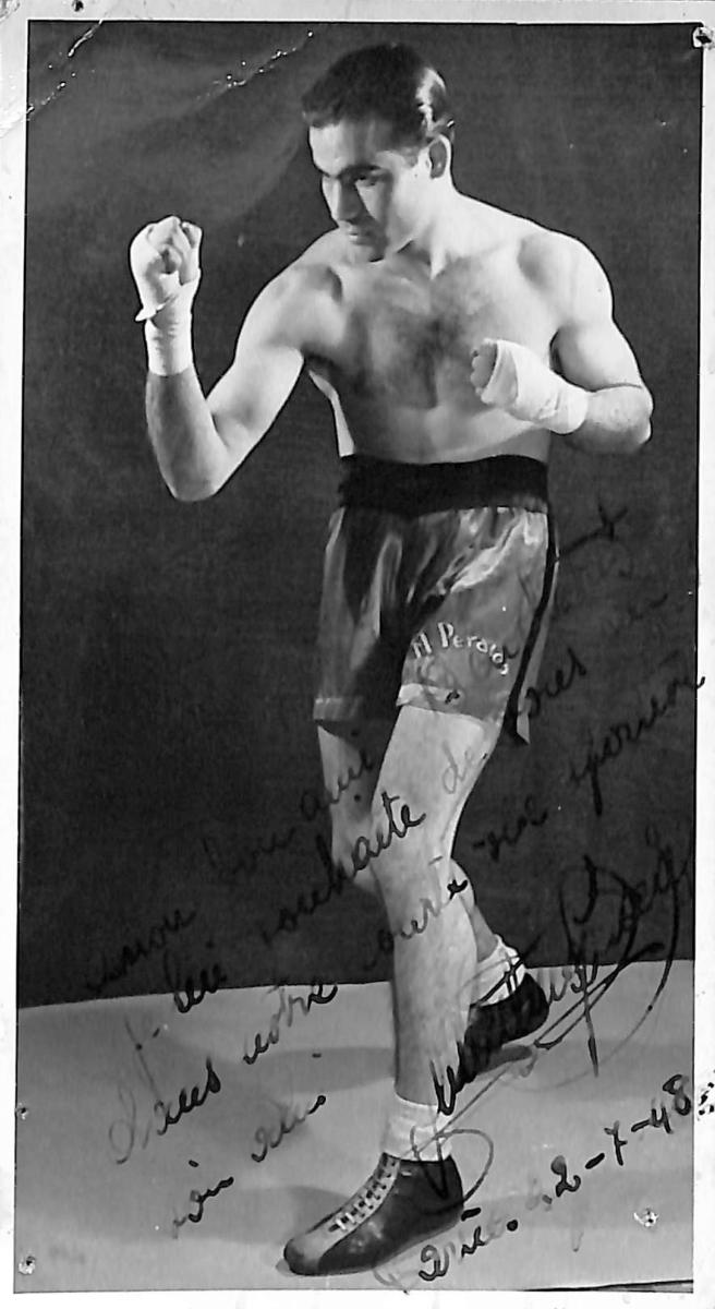 Carte photo dédicacée et datée du 02/07/1948 à Jean Jacques Benchetrit par un boxeur à déterminer. Etat d’usage avec trous de punaises.