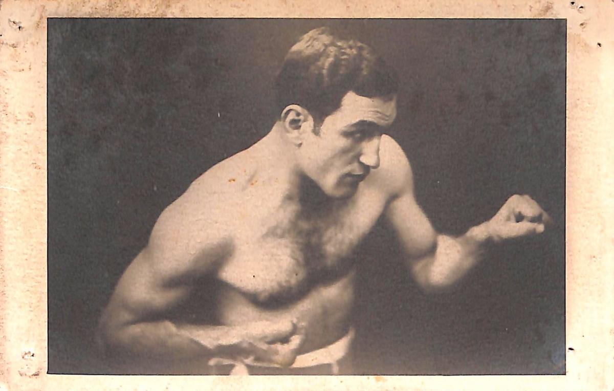 Carte postale d’un boxeur à déterminer. Etat d’usage avec trous de punaises.