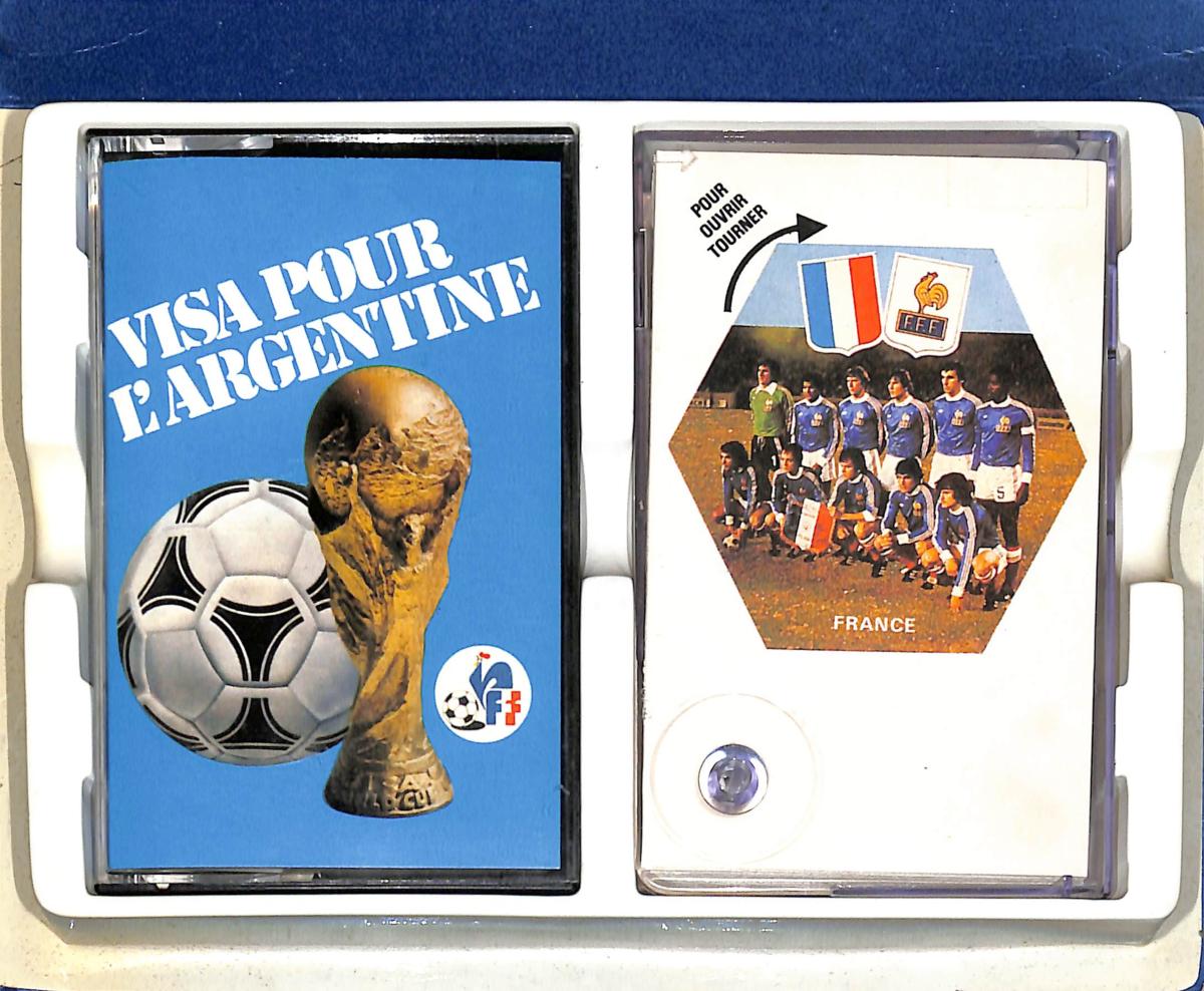 COFFRET SUR « VISA POUR L'ARGENTINE » POUR LE MONDIAL 1978 AVEC UNE CASSETTE AUDIO ET DES CARTES DE L'EDF. Format 13,5x18,5 cm. Bon état.